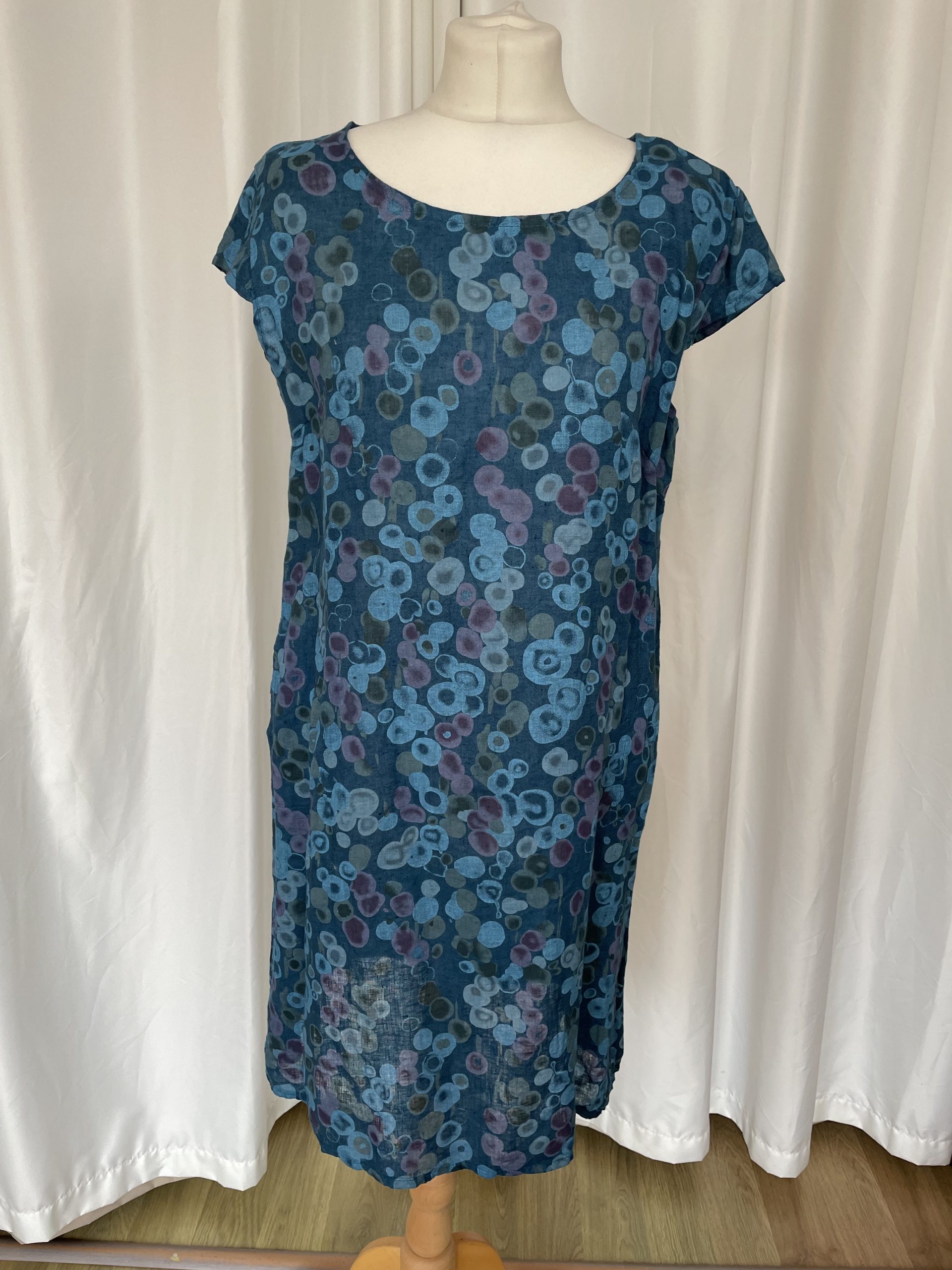 Linen dress poppy petrol Blue Would fit from size 10-16 With pockets and stretchy panels So comfy and cool too
